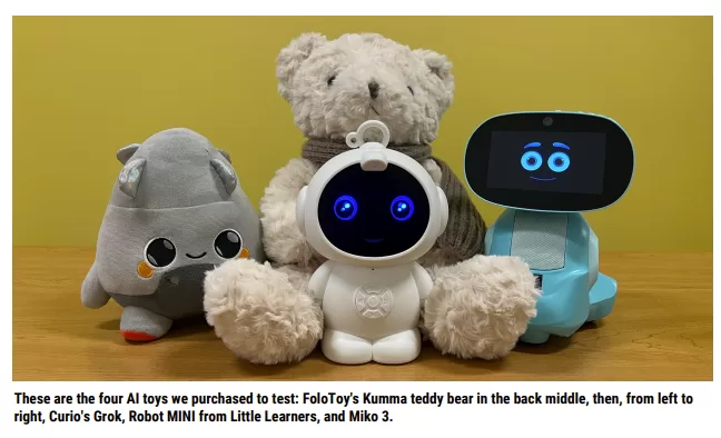 Toyland researchers purchased four AI toys to test. Curio’s Grok, FoloToy’s Kumma, Miko 3 and Robot MINI. Kumma is a plush bear with a speaker inside that did not provide any age range. Grok is a rocket aimed at ages three to twelve. Miko 3 is an expressive-faced robot marketed to children aged five to ten. Robot MINI barely worked at all because it could not maintain an internet connection, which is a kind of blessing considering what the functioning toys did instead.