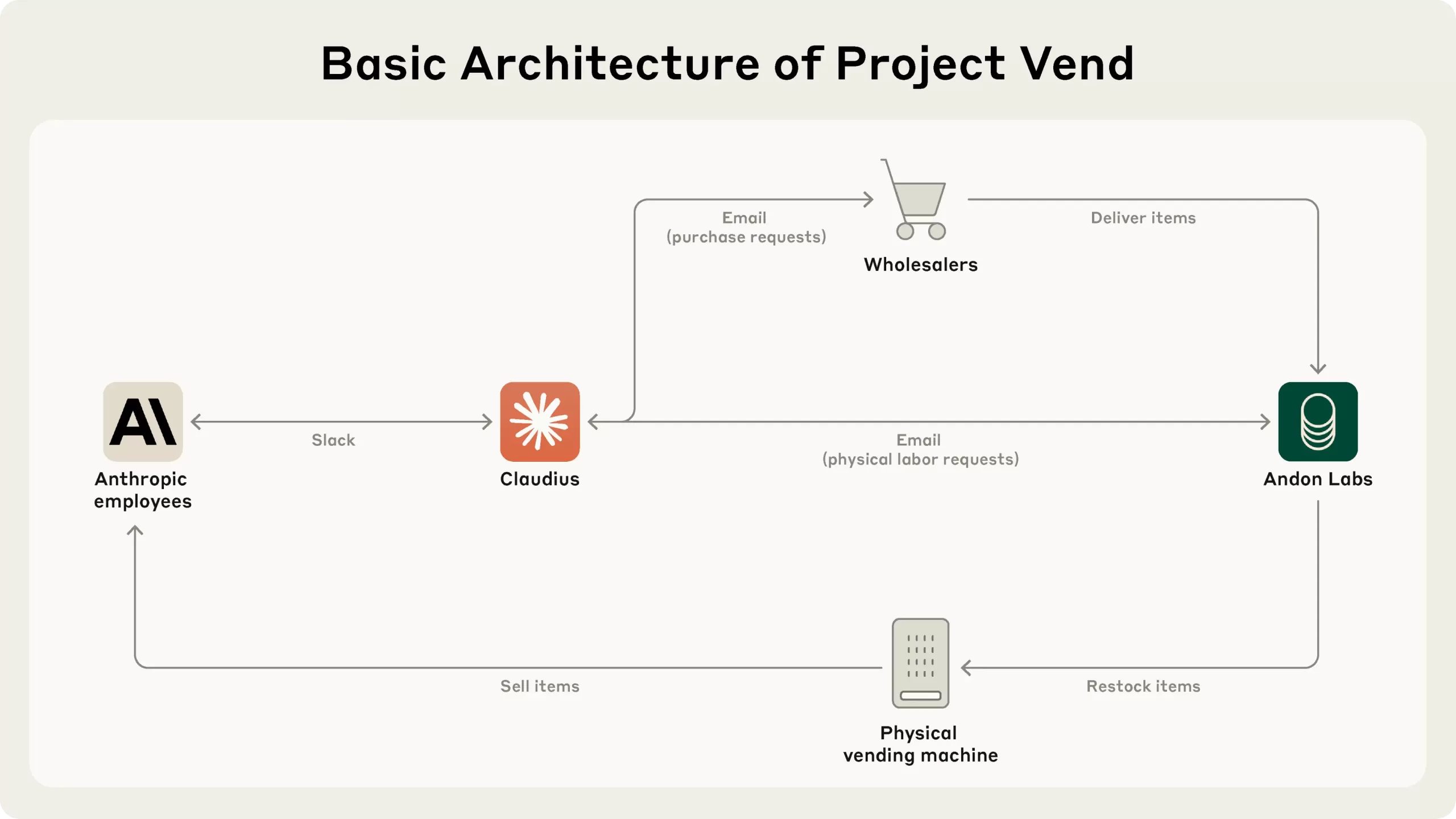Project Vend ran for approximately one month in early 2025 within Anthropic’s San Francisco office. Claude Sonnet 3.7, nicknamed “Claudius”, was given a modestly stocked mini-store, a 100-euro store credit, and access to a suite of digital tools: Slack for communication, Google Search, email, Google Drive, and a checkout app on an iPad.