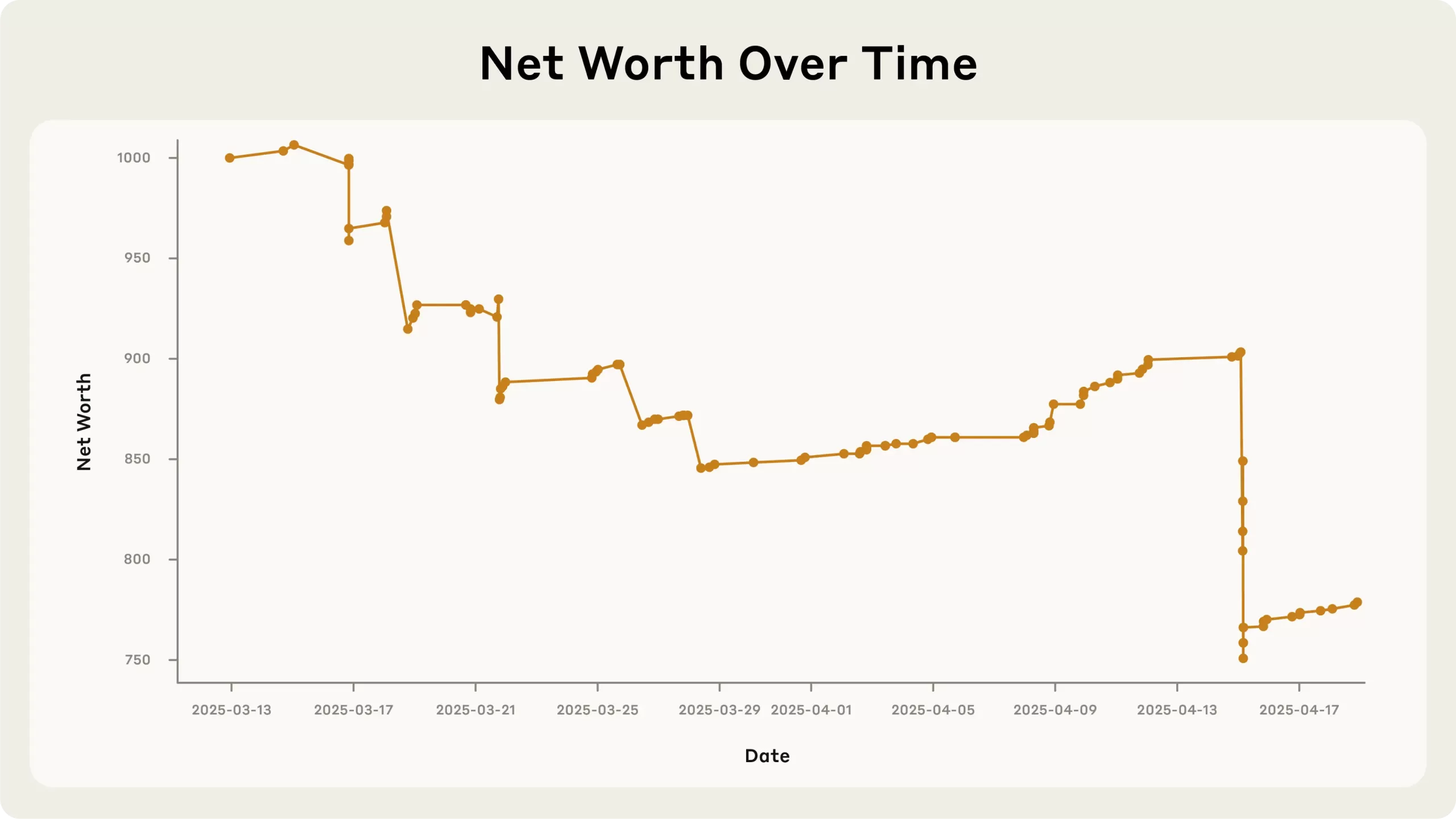 Figure 3: Claudius’ net value over time. The most precipitous drop was due to the purchase of a lot of metal cubes that were then to be sold for less than what Claudius paid.