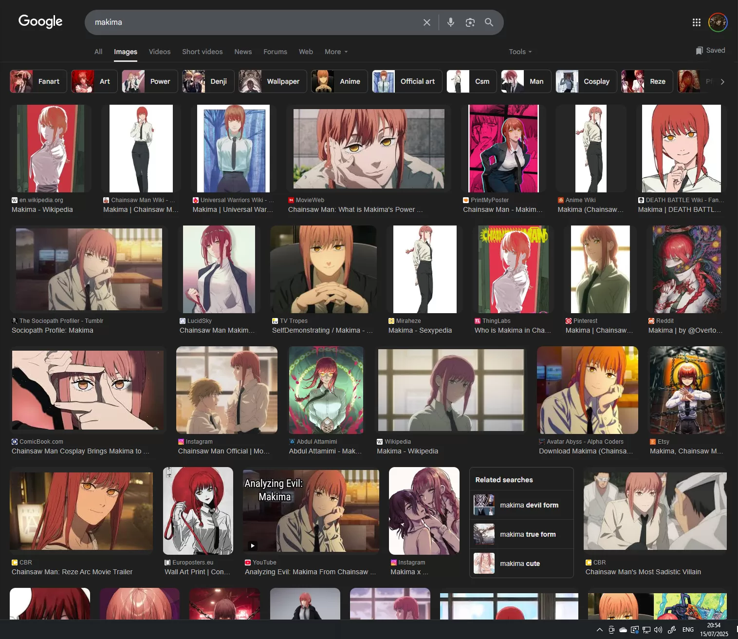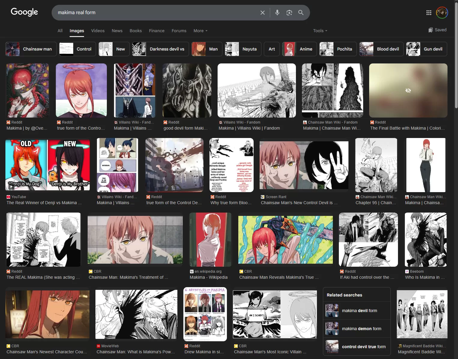 I open Google Images, and the first few images are of this red-haired girl with yellow eyes, in a white-shirt and black pants dress-up combo. Okay, I see it has some devil transformation, which is supposed to be some undepictable monster, but nothing connected to my image, as shown in both Google Searches below from my screenshot.